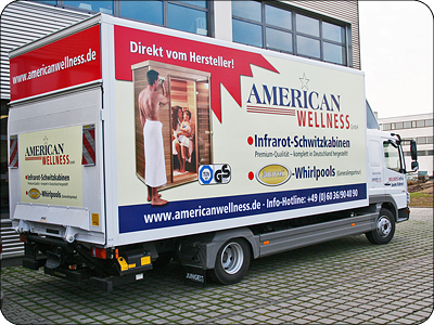 Das Fahrerhaus wurde in Plottechnik mit Firmenlogo und Anschrift versehen. |