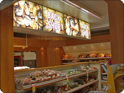 hinterleuchtet montiert oberhalb der Bäckerei. |