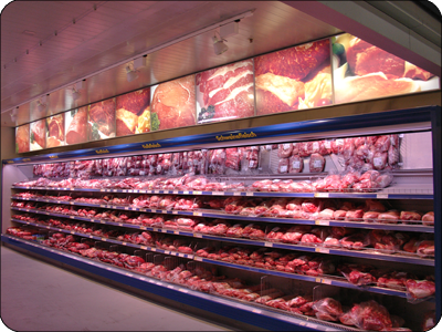 hinterleuchtet montiert oberhalb diverser Fleischregale in unterschiedlichen Größen. |