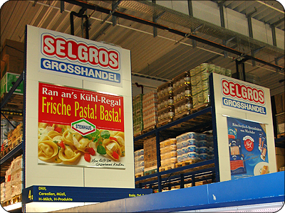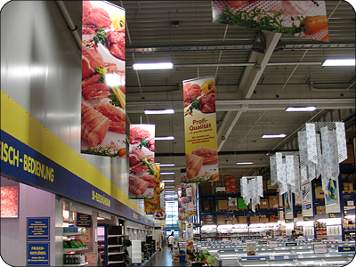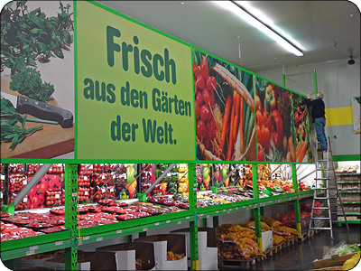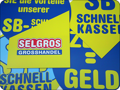 Komplette grafische Ausstattung der Großmärkte im Innen- und Außenbereich (z. B. Turmlogo, Gangbeschilderung, Großplakate)